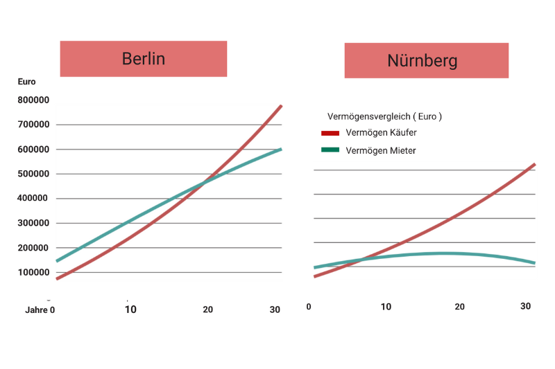 Die Grafiken zeigen die mögliche zukünftige Entwicklung des Vermögens eines Käufers und eines Mieters in Nürnberg und zum Vergleich in Berlin. Es wird angenommen, dass der Wert der Eigentumswohnung jährlich um 1 Prozent steigt und die Vergleichsmiete um 2 Prozent. In diesem Fall wäre der Wohnungskäufer in Berlin gegenüber einem Mieter nach 20 Jahren im Vorteil, in Nürnberg bereits ab dem siebtem Jahr.
