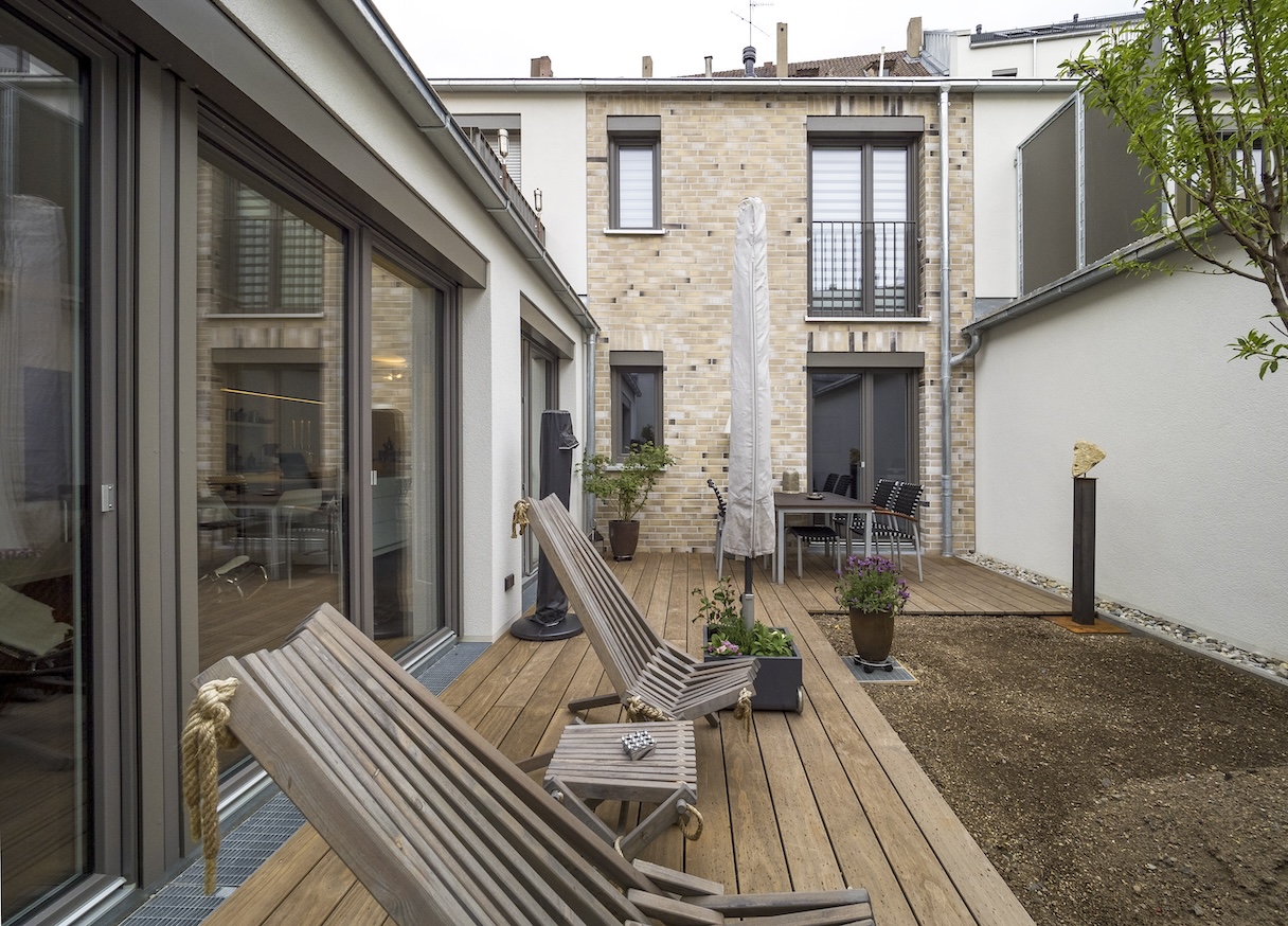 Wer sich aus dem Geschehen auf der Straße ins private Reich zurückzieht, spürt die Geborgenheit der Gebäude. Diese entsteht ganz natürlich aus den geschickt organisierten Wohnflächen, die Vertrautheit schaffen und Freiräume öffnen. Die Auswahl der Baumaterialien und Proportionen verstärkt den Eindruck naturnahen Wohnens in der Stadt. Konsequent ausgeführt ist dieser Gedanke in den Atriumhäusern, die einen grünen Innenhof – eine Art Patio – bieten.